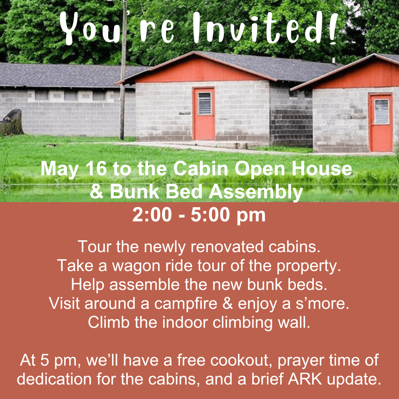 At 5 pm, we’ll have a free cookout, prayer time of dedication for the cabins, and a brief ARK update.