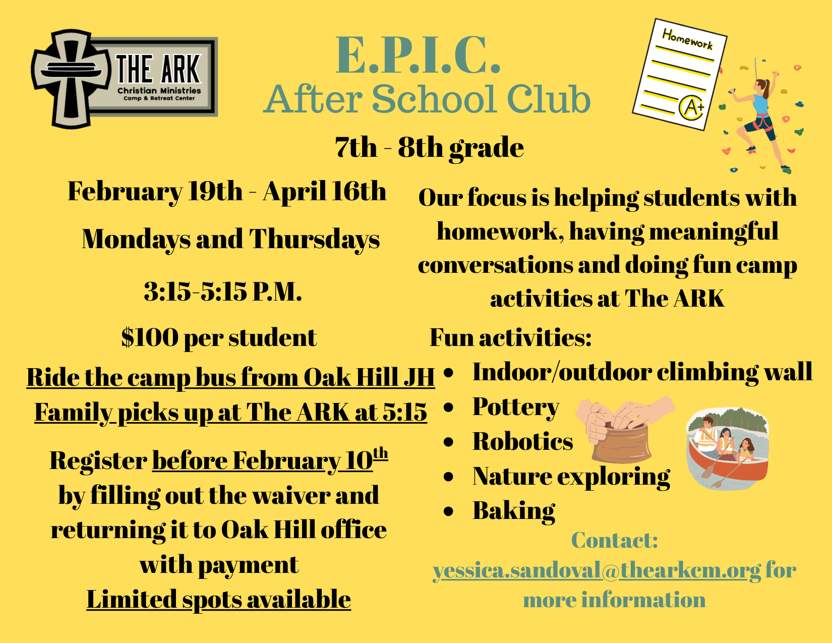 This after-school program is designed just for 7th & 8th grade Oak Hill students. Liability release waivers and scholarship forms are available to download and print below or hard copies can be found in the school office or at THE ARK. Questions? Please call Yessica at THE ARK at 765-395-3638.